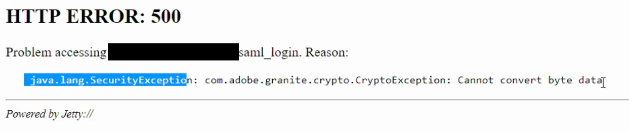 15.05.2019 22:59:45.428 ERROR [qtp192509136-4428] org.apache.felix.http.jetty Exception while processing request to /XXXXXXXXXXXXXX/saml_login (java.lang.SecurityException: com.adobe.granite.crypto.CryptoException: Cannot convert byte data)