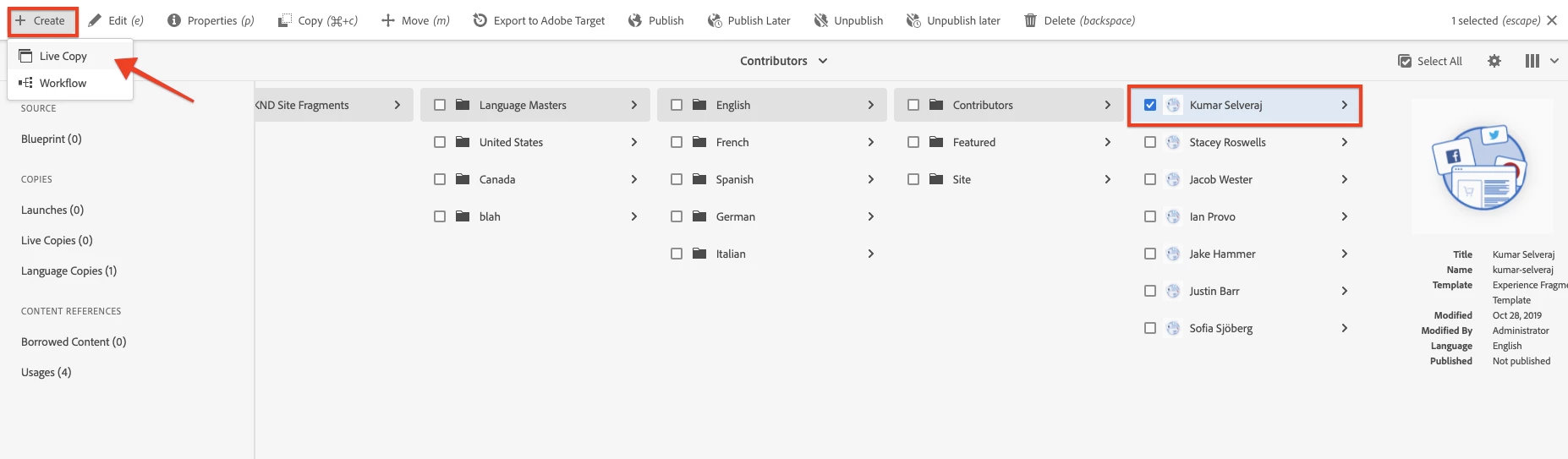 We are on AEM 6.5.3. I have an experience fragment in the "en" language. And I want to create a live copy of this XF in the es languages. When I select experience fragment and click on create, I see an option to create variation-as live copy, but that creates the live copy in the same hierarchy is that possibility to create XF with MSM.