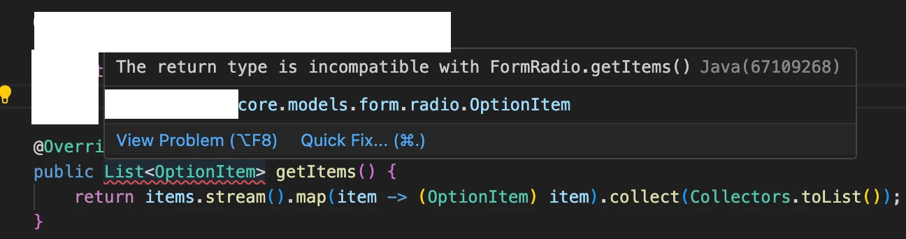 seems you are return something.core.models.form.radio.OptionItem instead of com.adobe.cq.wcm.core.components.models.form.OptionItem