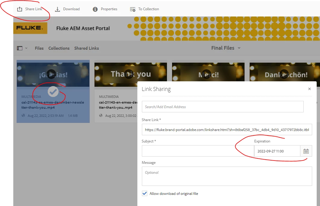 | Request for Feature Enhancement (RFE) Summary: | Will you please consider changing the Brand Portal Share Link Expiration date or allowing admins to create a custom date for all assets. My users are complaining that they have to change it every time they use it to extend it further and one week is too short of a time frame. |