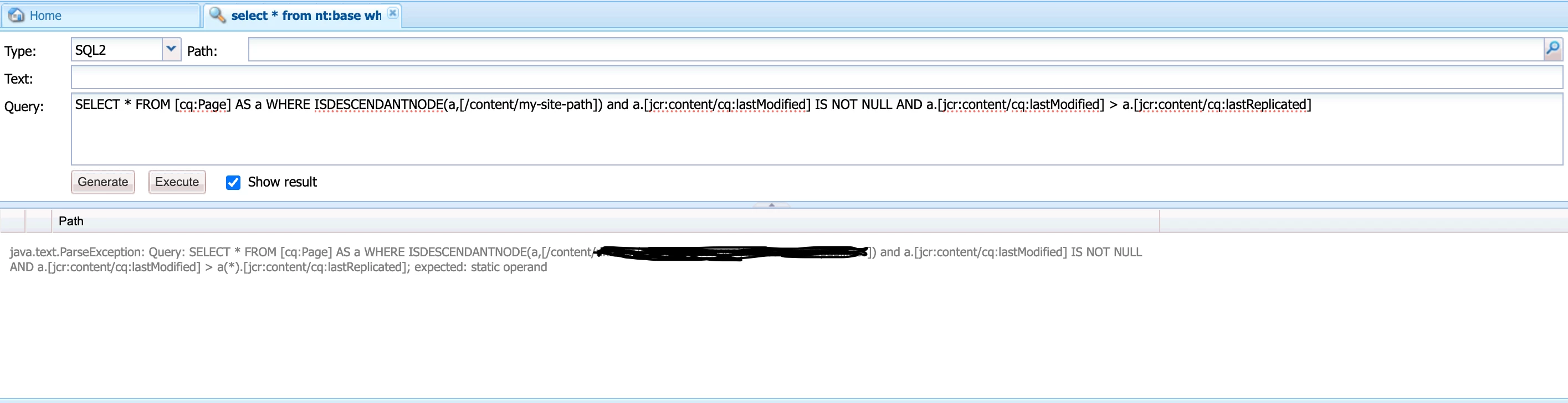 I am trying to find all the pages under the site tree that were modified after they were last published (where last modified dates is greater than last replicated date). I am running this query in CRXDE choosing SQL2 option but get the "static operand error"
