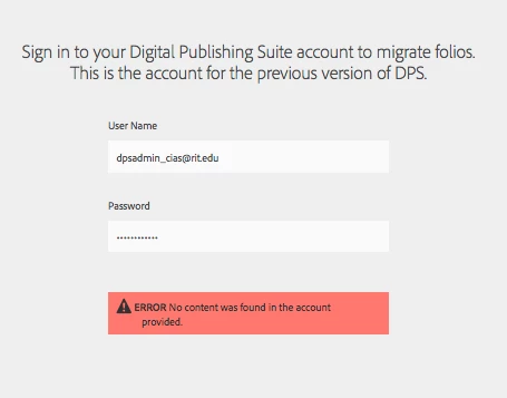 When I try to log into my Adobe DPS/Content viewer folio account in the new Adobe Publish web portal, I received the error: "ERROR: No content was found in the account provided." I can still see my content on the viewer app on a device. Is there a bug or a fix for this?