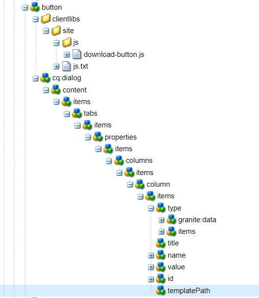 I've created a button component and given resourceType "core/wcm/components/form/button/v2/button". I have added dialog to my component because an extra field was supposed to be added (Path Browser). I need to get the path browser value given in dialog box in js file. How can I do that?