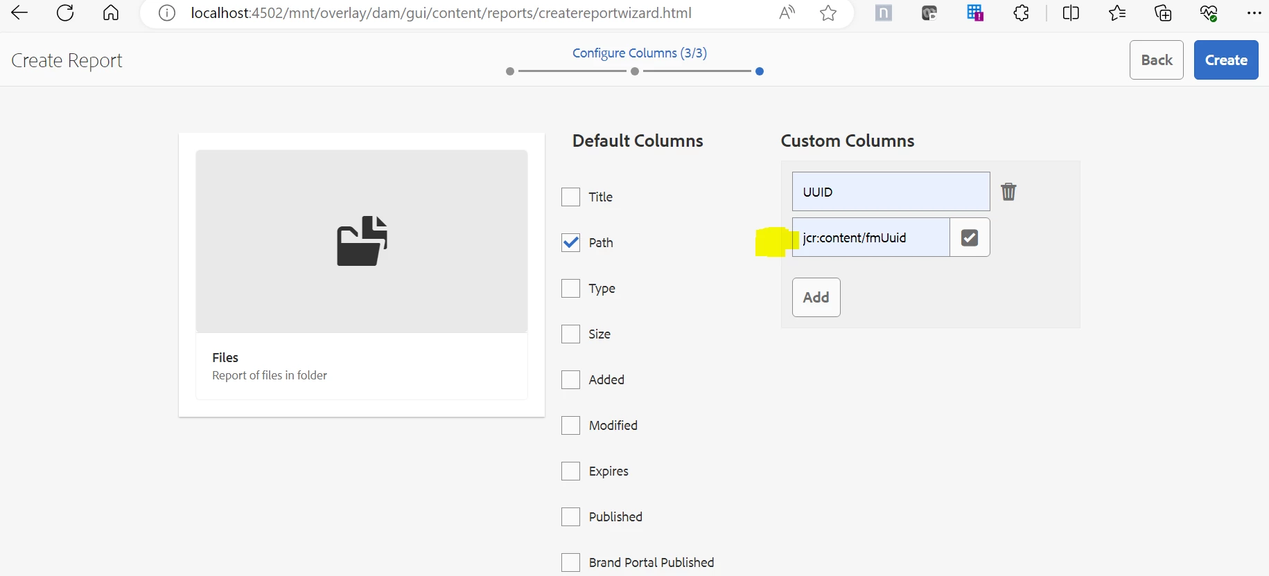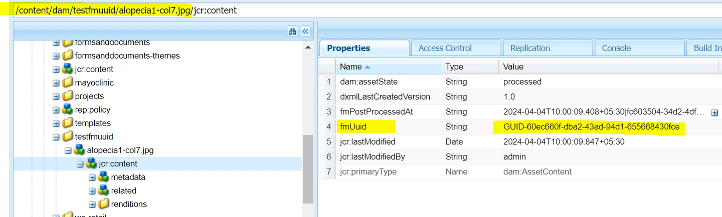 I want a report with the asset path and fmUUID for my images test folder highlighted in yellows below.
