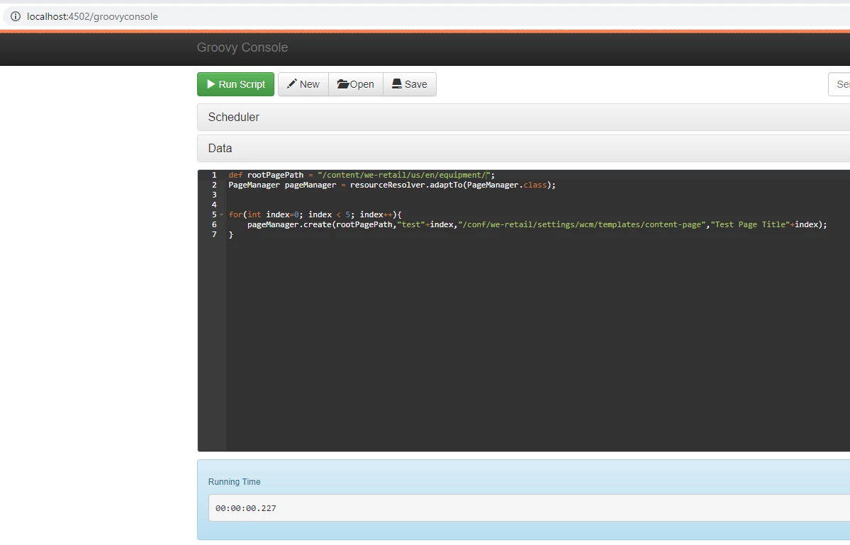 pageManager.create(rootPagePath,"Debal"+index,"/conf/we-retail/settings/wcm/templates/content-page","Test Page Title"+index);