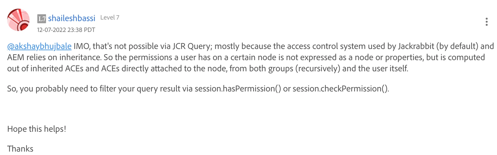 So, you probably need to filter your query result via session.hasPermission() or session.checkPermission().