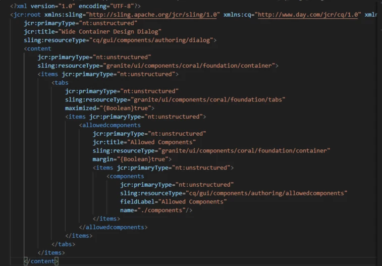 I have contaner component, for that container I need allow few list of components, for that I have created a component with cq:designDialog with allowed component. in html I added parsys below are the files.