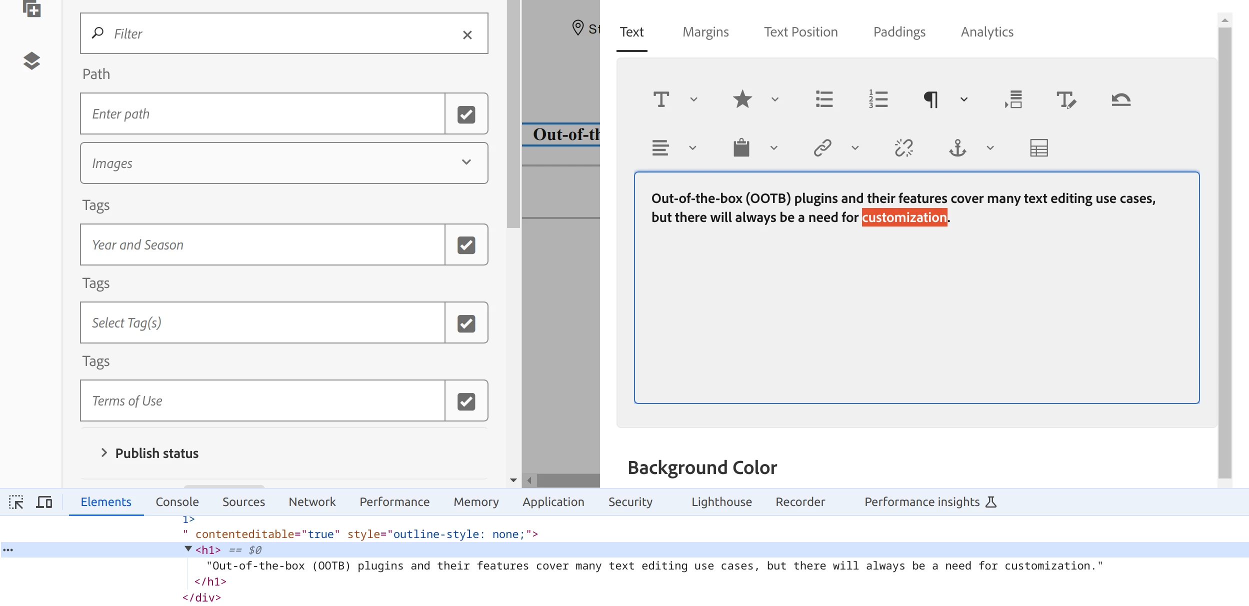 <h1>Out-of-the-box (OOTB) plugins and their features cover many text editing use cases, but there will always be a need for customization.</h1>I want to have to class attribute something like below