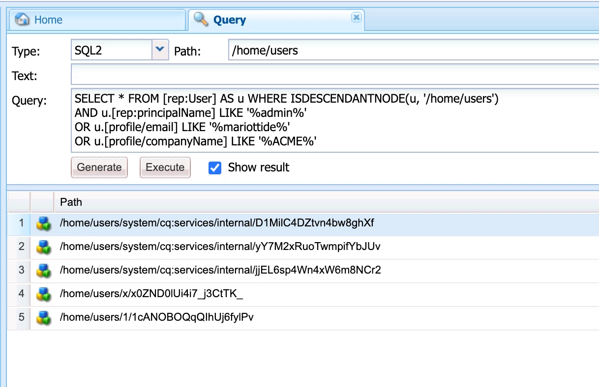 StringBuilder queryBuilder = new StringBuilder("SELECT * FROM [rep:User] AS u WHERE ISDESCENDANTNODE(u, [/home/users])");