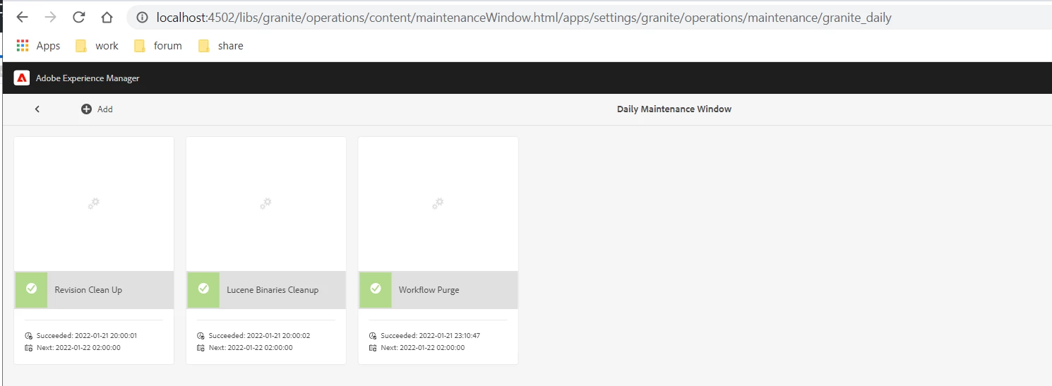 In my local I am able to access the maintenance page and run the workflow or check the status of previously ran maintenance job at the url http://localhost:4502/libs/granite/operations/content/maintenanceWindow.html/apps/settings/granite/operations/maintenance/granite_daily