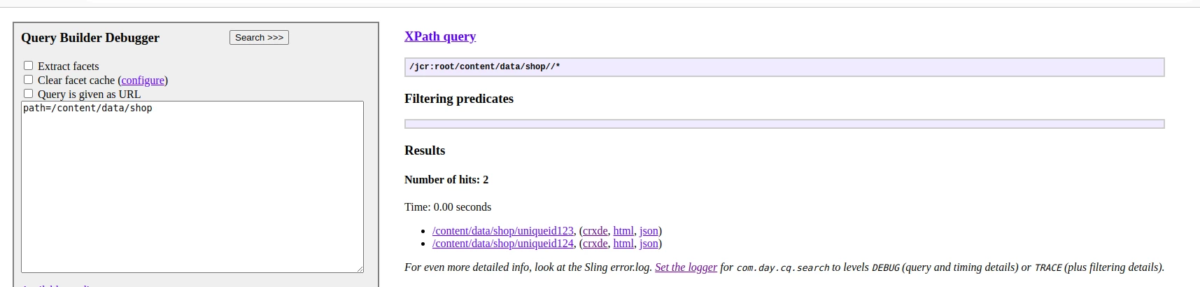 You may easily extract the shop id from path(string operation- split) of search result. Even we can use shopName as well shopAddress to check if present by grouping property in query.