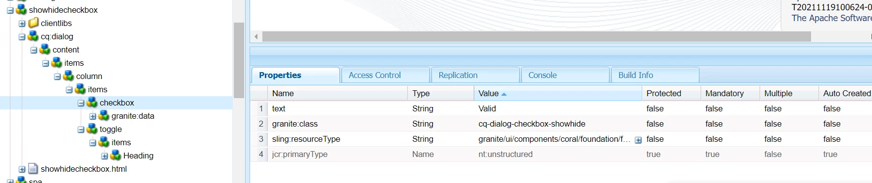 2. Add cq-dialog-checkbox-showhide-target data attribute to the granite:data node under checkbox and value will be jquery selector I have used .toggle.