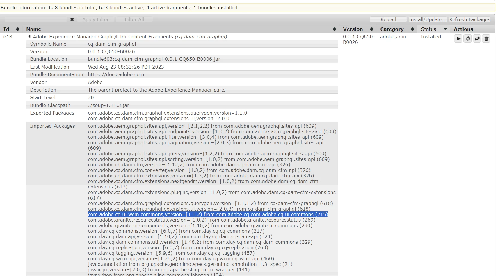 We noticed the bundle "Adobe Experience Manager Graph QL for Content Fragment scq-dam-cfm-Graph QL" is in installed state and we couldn't change that to active state.