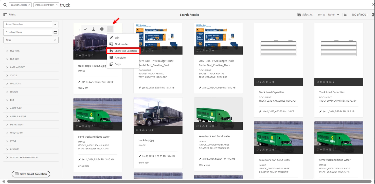 1. We login to Brand Portal 2. We do a search for lets say "Truck" keyword in search bar. 3. Lets say, 25 assets show up in the search results. 4. Now, we want to navigate/go to the location/folder of any of one of these 25 assets. 5. Need an option to go to the location/folder of the asset. |