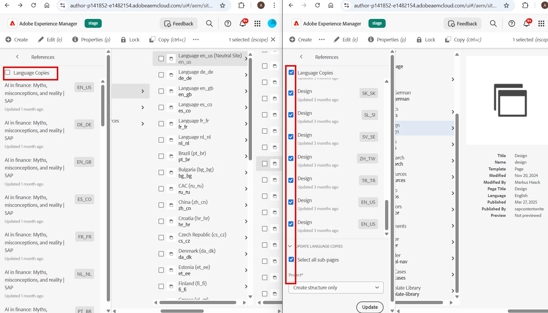 In AEM Cloud UE, I want to update language copies or create structure. I want to be able to select particular languages without having to check all 33 languages first and then uncheck the ones that are not needed so that I can work efficiently and without wasting time.