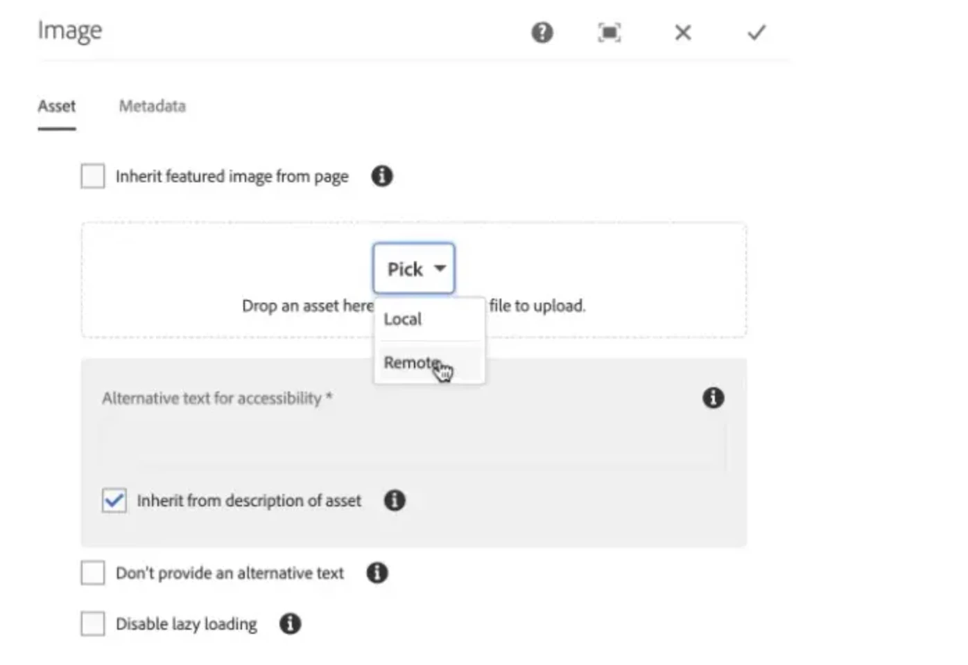 However, as per the documentation I should see the option of Pick drop-down with options Local and Remote.