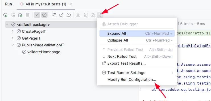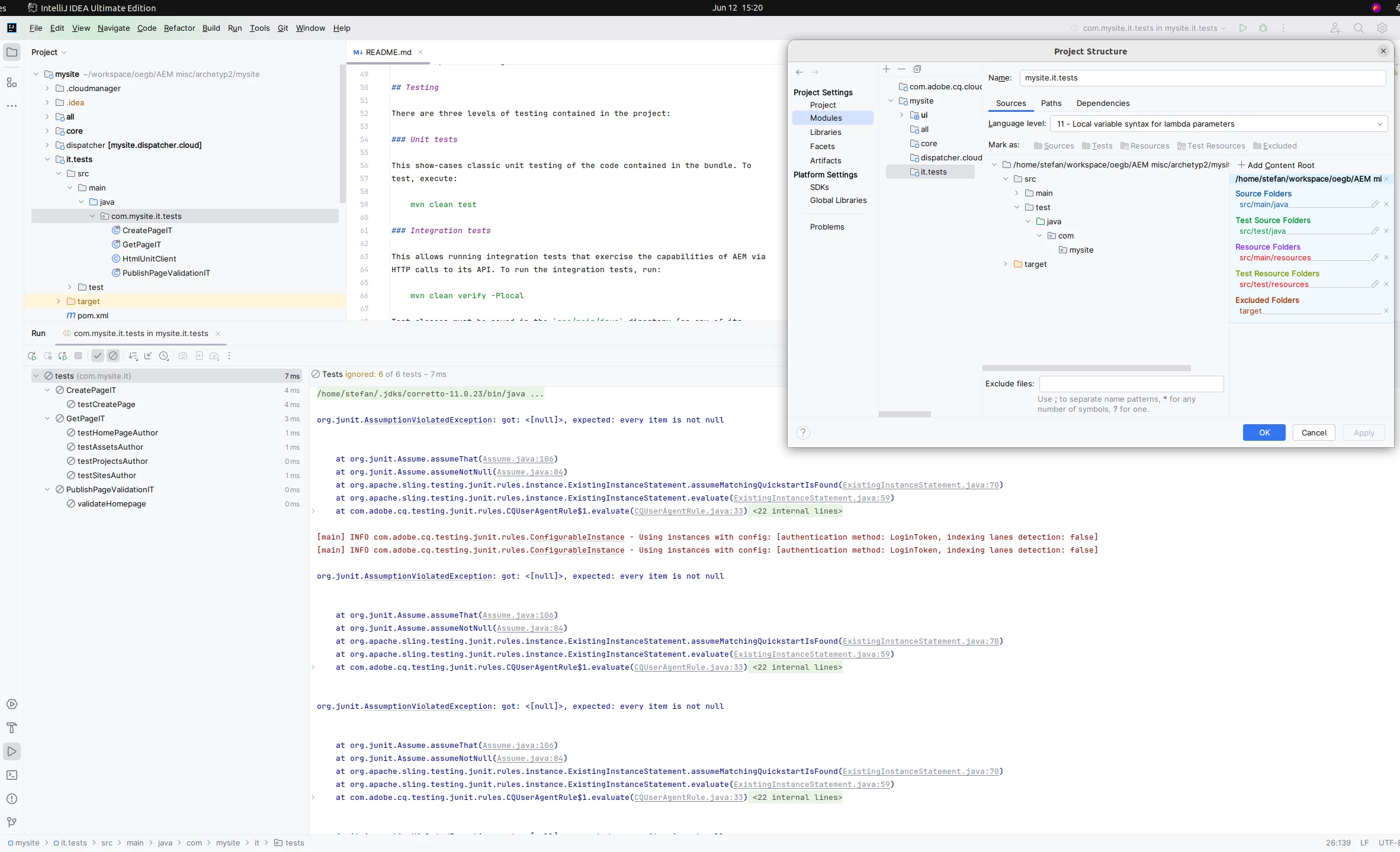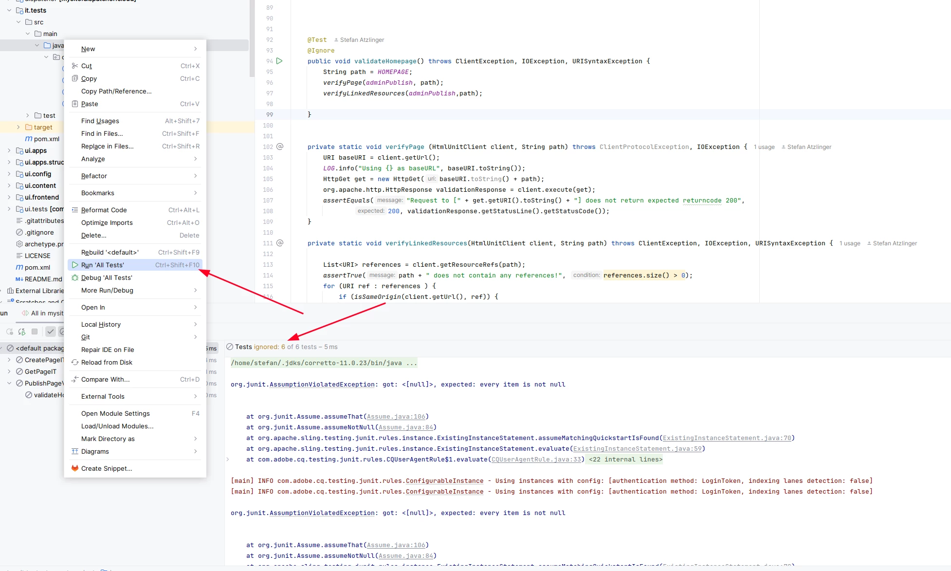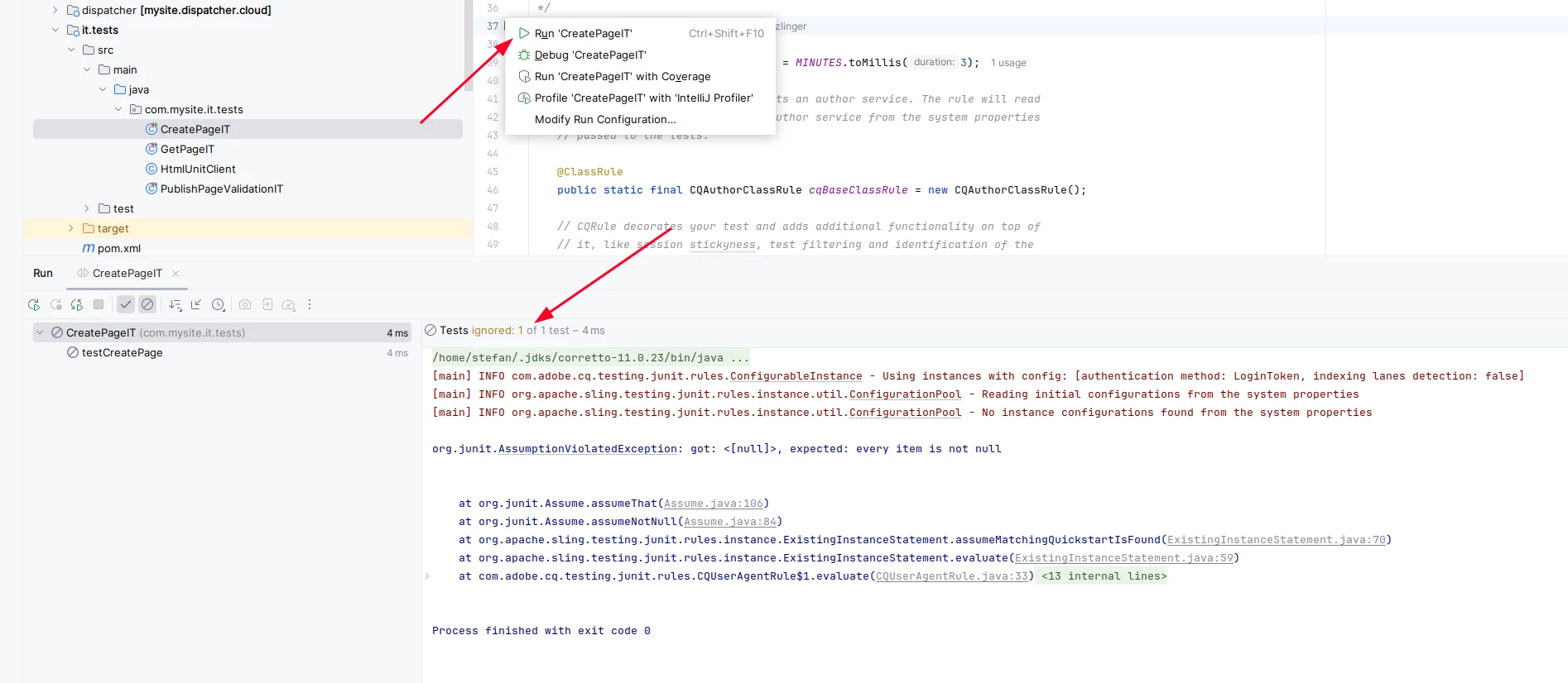 When I press the green run button for the integration tests intellij tell me they are ignored.