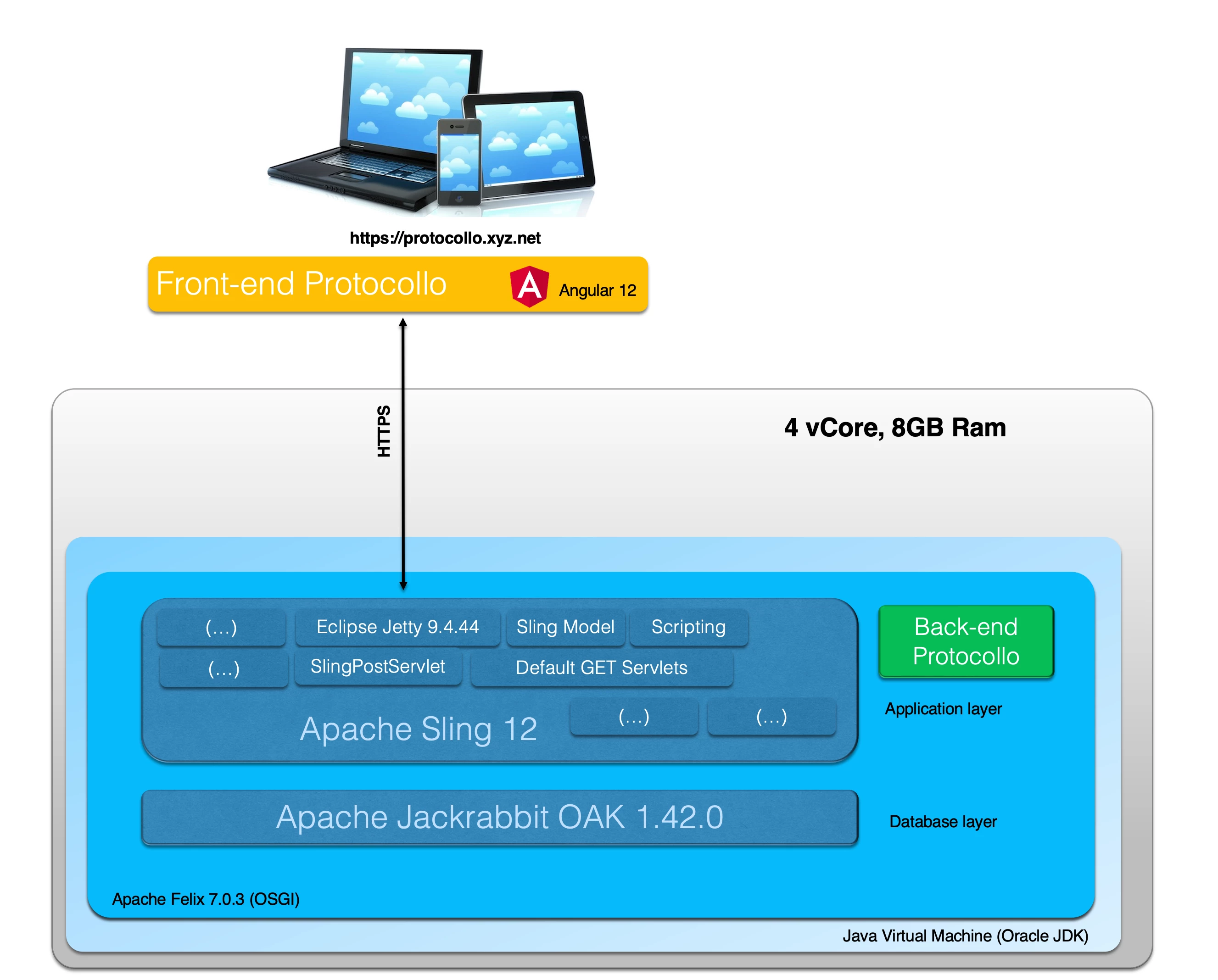 Our architecture is composed of an Apache Sling 12 installed on a single node: is this similar to an AEM Author instance? Is it a Publish instance? This is not a web content management application, and our architecture does not require publishing data to one or more different instances, so there is not a publishing environment. We decided to not install a web cache as the Protocollo Informatico works only with authenticated sessions and data is protected by many ACLs: for these reasons, two different authenticated users will have strictly different visibility of the data. An HTTP accelerator like Varnish (a product very similar to Adobe Dispatcher), would not provide dramatic speed improvements as only a few contents are cacheable. Like the Dispatcher, an HTTP accelerator could be configured to act as a web application firewall to detect and filter malicious requests before they reach the Apache Sling instance. We decided to not use a web application firewall because the application runs inside an intranet, few objects/nodes are accessible by anonymous users and we did not expect attacks to the application from the intranet, by authenticated (and monitored) users. For these reasons, the logical and physical architecture coincide.