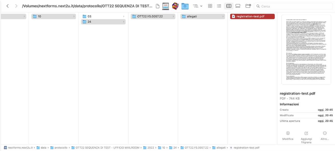 End users can manage files with the new Protocollo Informatico client and via Webdav: Apache Sling and Adobe AEM offer this alternative way to browse the database, mapping the JCR repository as a standard disk of their workstation. Below is an example of navigation of the Protocollo Informatico via the Finder on Apple macOS: a user can add files remove, copy files directly via macOS Finder on Windows Explorer file managers.