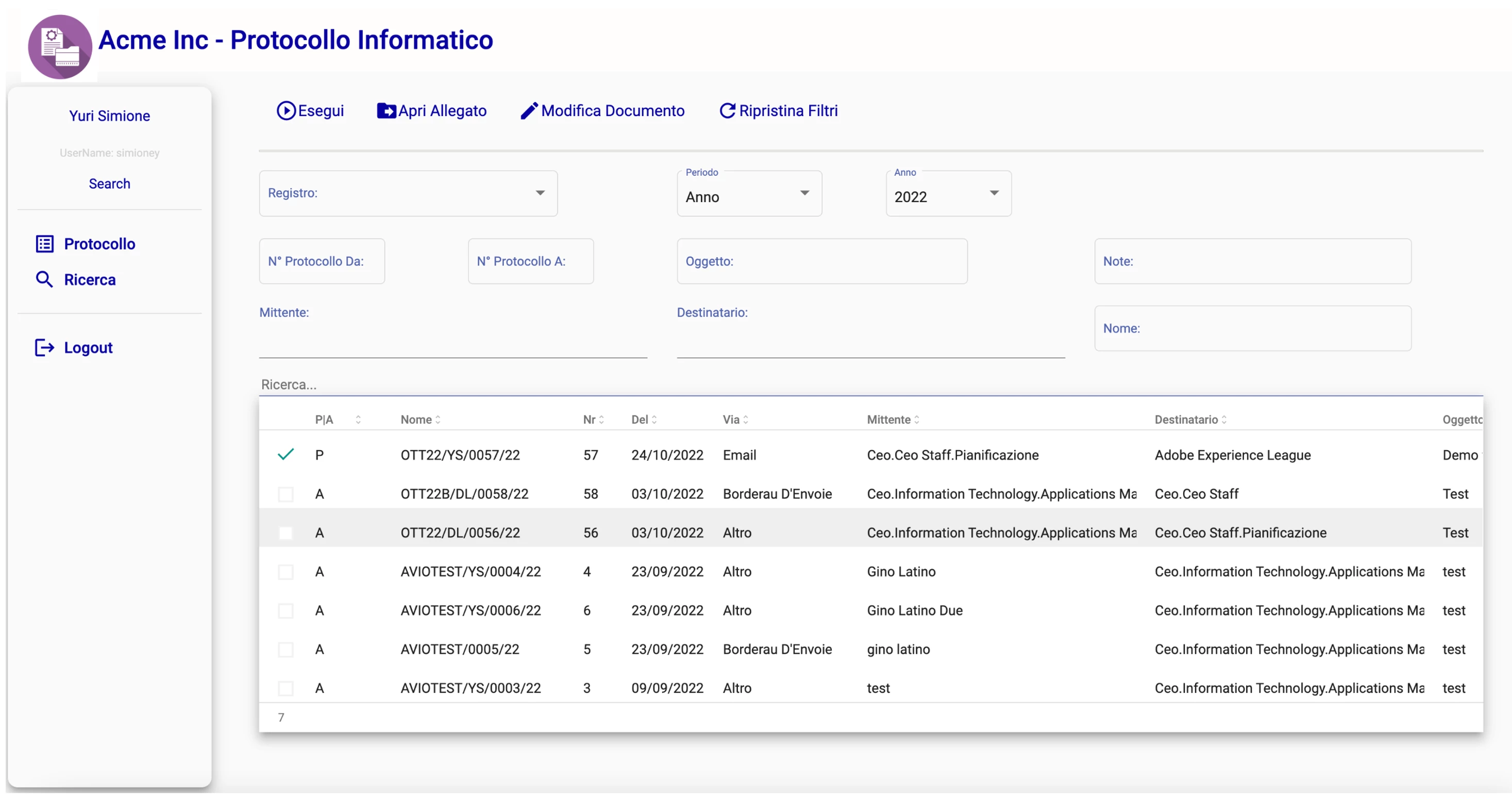 The Protocollo Informatico application is used by about 150 users to manage fifty-thousand documents, all with the same set of metadata. This application is used to provide a unique ID to each document sent or received by several offices of this customer. Each office has its own counter to generate new IDs. An end-user can belong to more than one office and he or she can edit only the documents of the office to which he or she belongs.