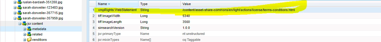 Option 2: opens up another metadata field "License". Which is connected to ./jcr:content/metadata/xmpRights:WebStatement.