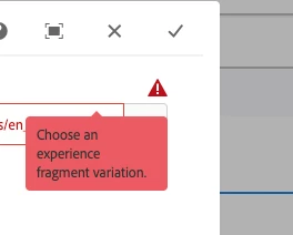 I am unable to select a variation in the experience fragment, even though I have selected a variation in the dialog. I am receiving the error message: "Choose an experience fragment variation."