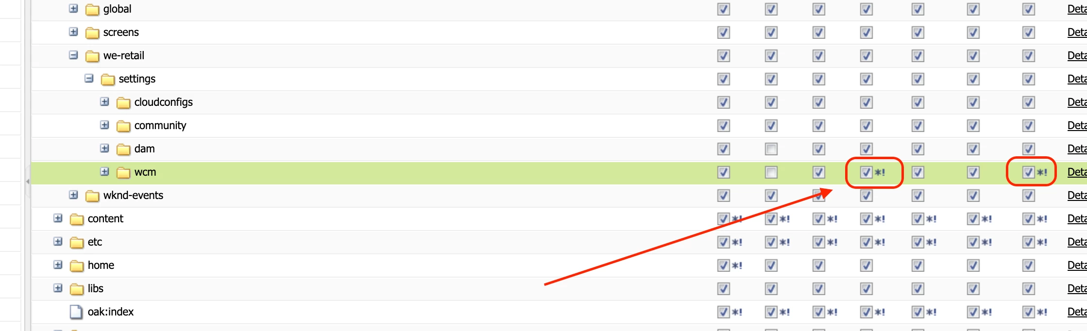 XXX user has all permissions for /conf/project/setting/wcm these permissions are coming from administrator group.