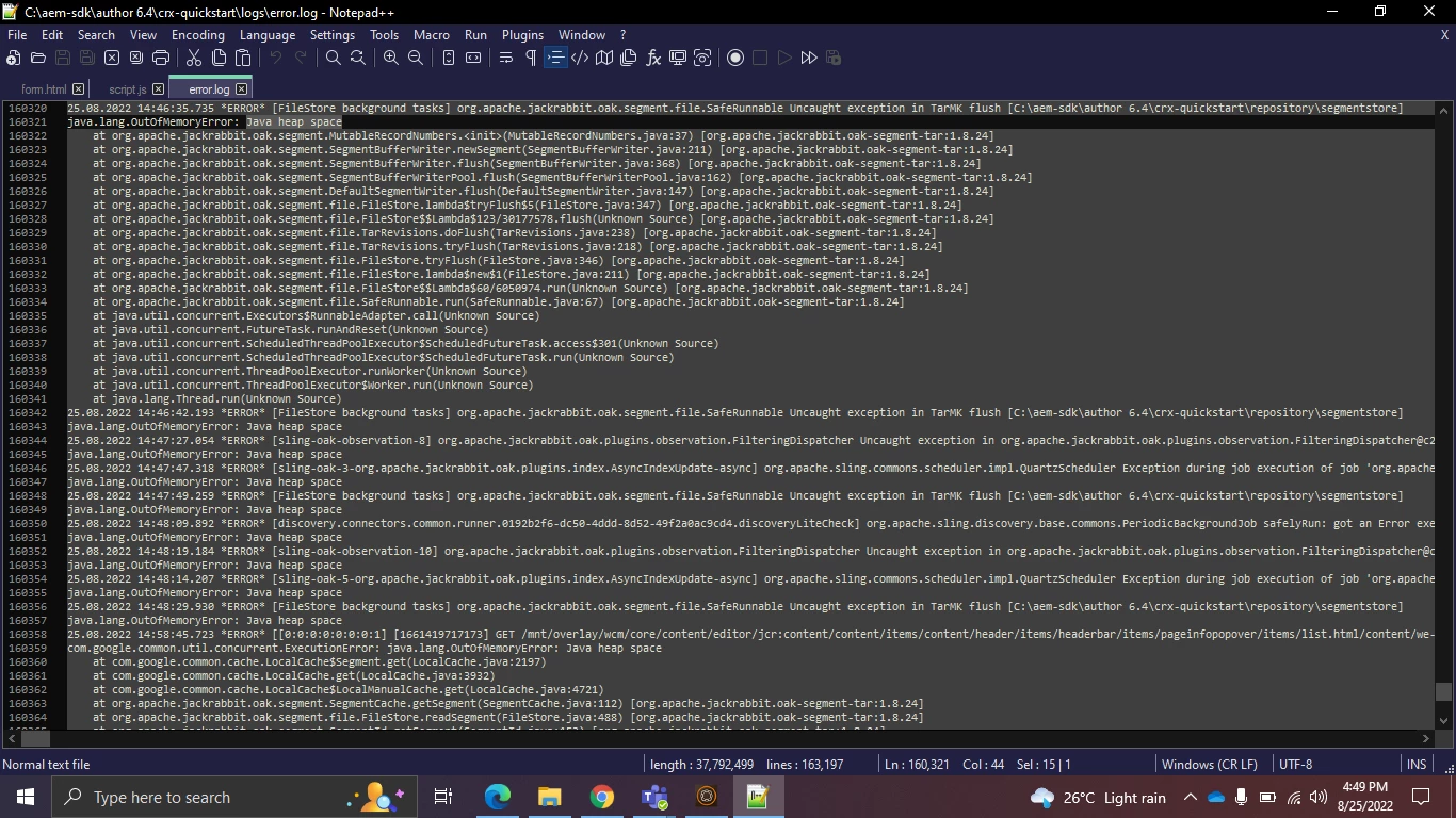 I'm using AEM 6.4 and Java 8, when i'm trying to install my project files through CRX Package Manager, While Installing the Package Java Heap Space error coming and says like out of memory, I attached the error Screenshot below