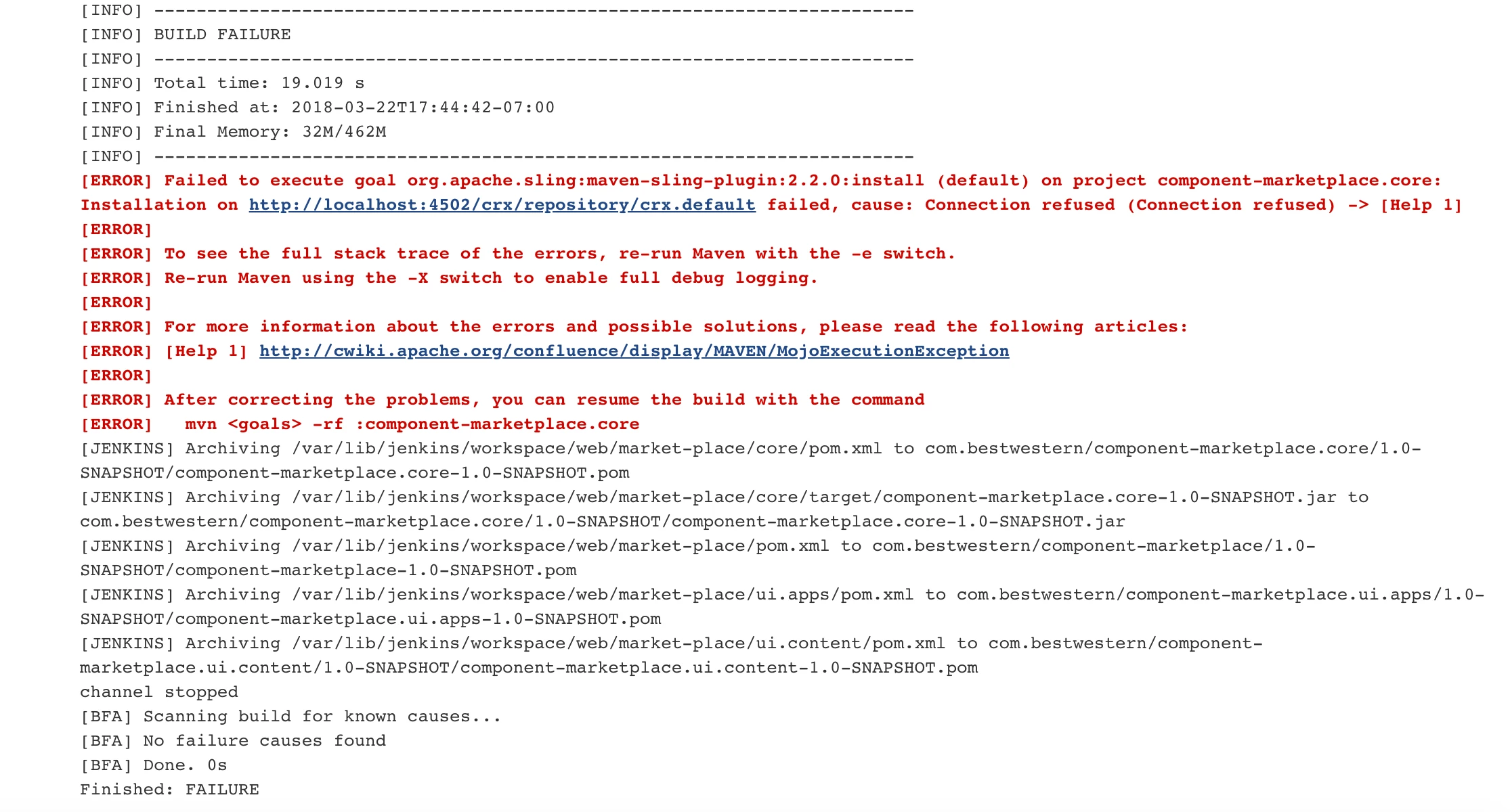 Failed to execute goal org.apache.sling:maven-sling-plugin:2.2.0:install (default) on project component-marketplace.core: Installation on http://localhost:4502/crx/repository/crx.default failed, cause: Connection refused (Connection refused) -> [Help 1]