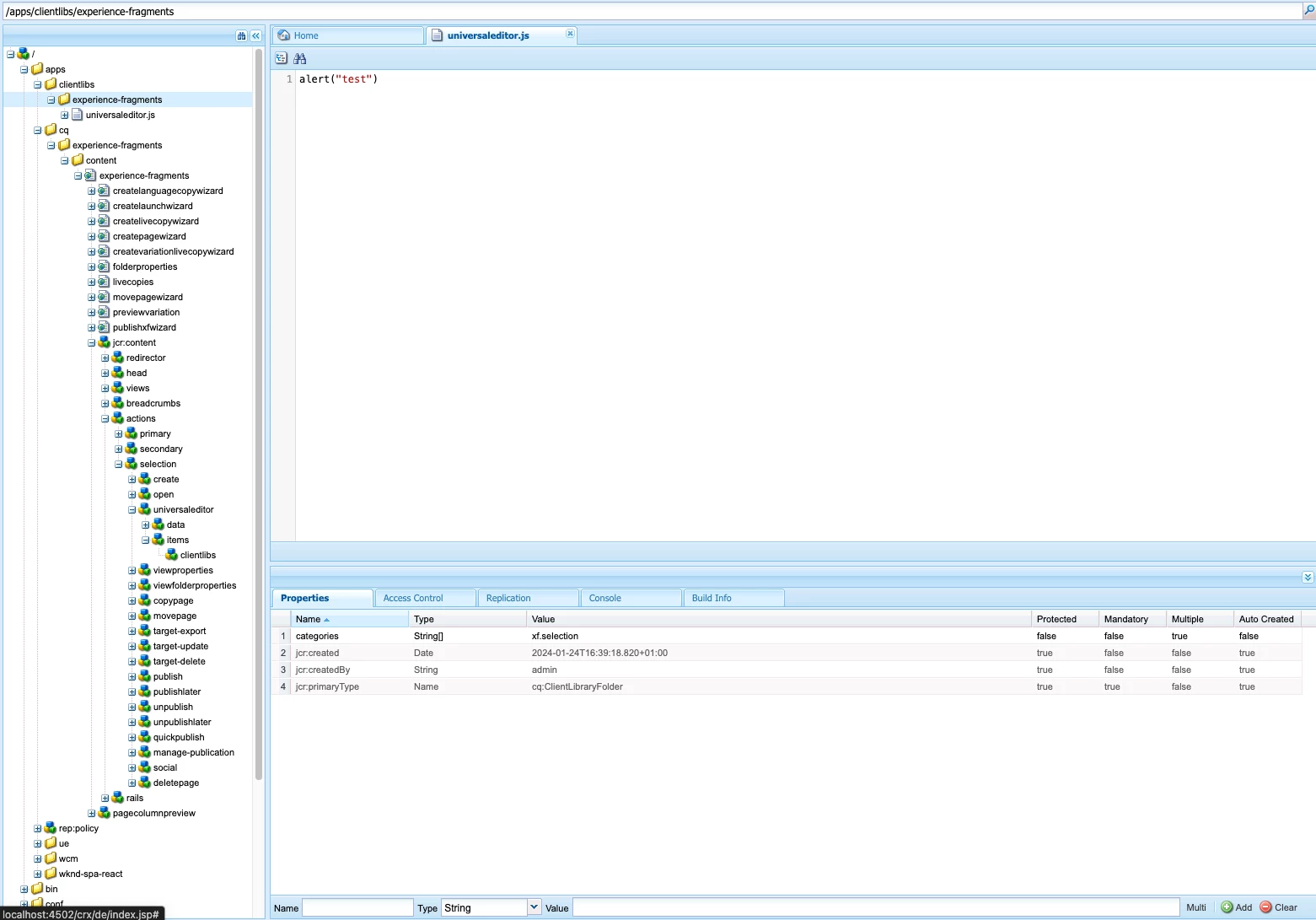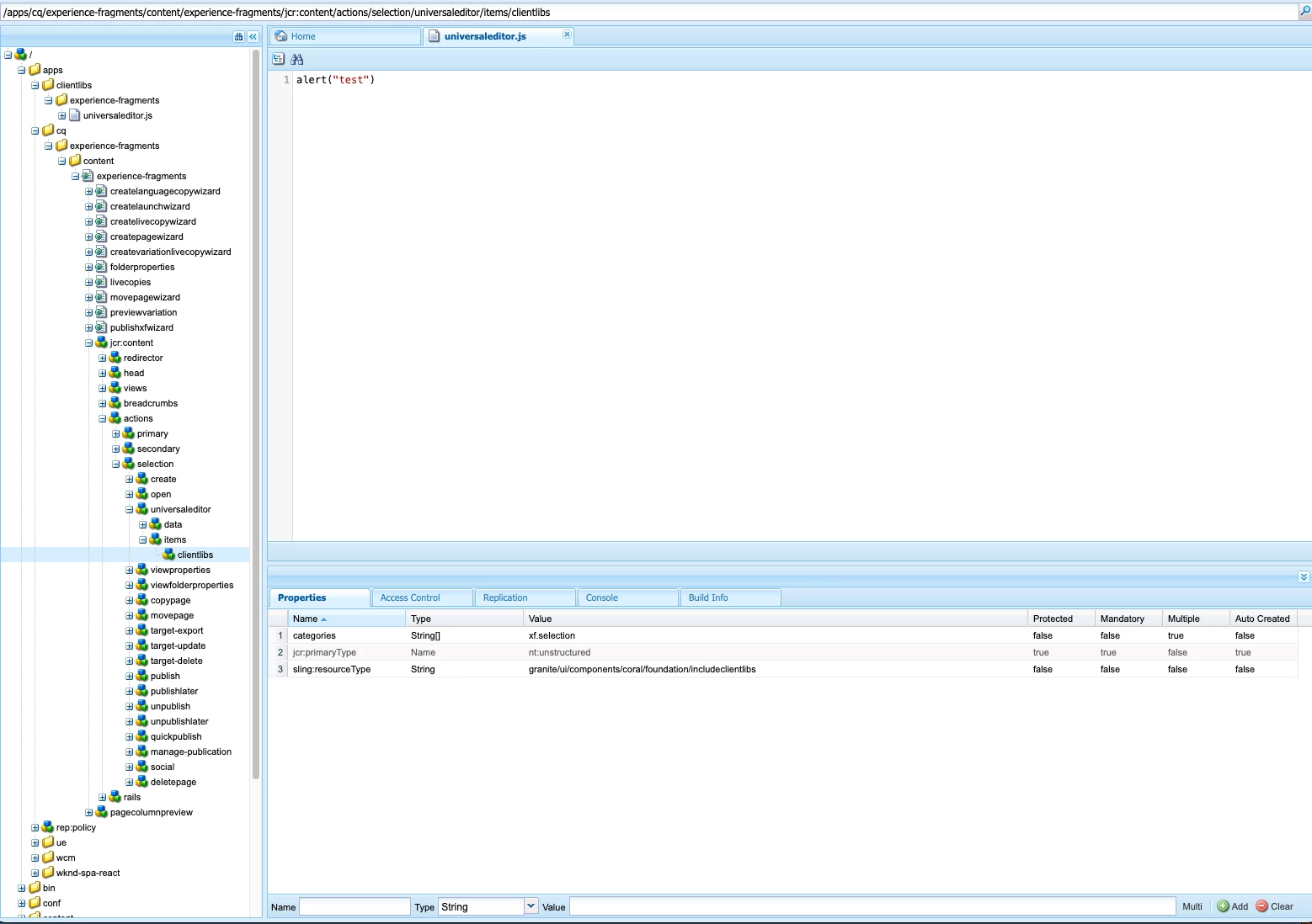 The clientlibs folder is created with some categories andcq:ClientLibraryFolder jcr:primaryType (screenshot 1) and containing the script universaleditor.js. The button "universaleditor" has the child "items" containing the node "clientlibs" with the categories of the clientlibs folder and sling:resourceType granite/ui/components/coral/foundation/includeclientlibs (screenshot 2).