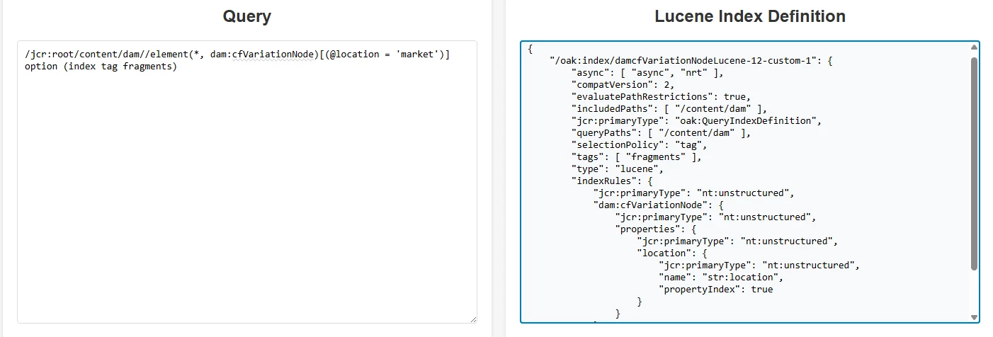 { "/oak:index/damcfVariationNodeLucene-12-custom-1": { "async": [ "async", "nrt" ], "compatVersion": 2, "evaluatePathRestrictions": true, "includedPaths": [ "/content/dam" ], "jcr:primaryType": "oak:QueryIndexDefinition", "queryPaths": [ "/content/dam" ], "selectionPolicy": "tag", "tags": [ "fragments" ], "type": "lucene", "indexRules": { "jcr:primaryType": "nt:unstructured", "dam:cfVariationNode": { "jcr:primaryType": "nt:unstructured", "properties": { "jcr:primaryType": "nt:unstructured", "location": { "jcr:primaryType": "nt:unstructured", "name": "str:location", "propertyIndex": true } } } } } }