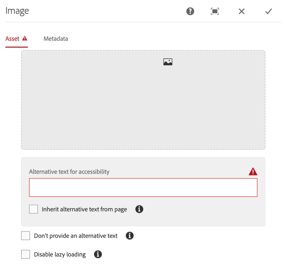 Alternative Text is required field in Image (v3) Core Component. I extend image component in my project and update q:dialog with required={Boolean}false. Still I got error message although asterisk is not showing in this case.