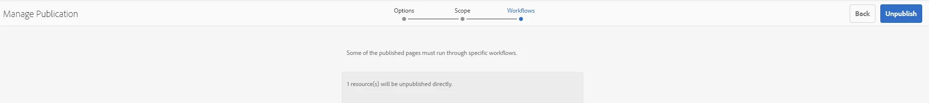 Since we are on 6.5 I think some defaults have changed. If I want to unpublish a page I can usually go to "Manage Publication" and click unpublish. Then click scope, then finish....now it has Workflows....and I click "unpublish" and nothing happens. I am wondering either how to I take away the "Workflows" or is there something wrong and it should go back to menu?
