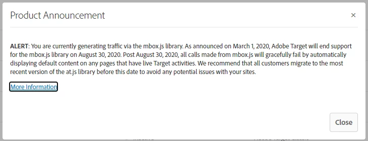 I recently got below Alert when logged into Adobe Target, so I started migrating mbox.js to at.js and as part of that installed Adobe TargetV2 Launch extension(we are using Adobe Launch for Tag Management) and modified the All Pages - Library loaded rule, and we had mbox.js calls replaced with , https://clientId.tt.omtrdc.net/rest/v1/delivery? which i am thinking is pretty much the upgrade process, but we started seeing Uncaught ReferenceError: CQ_Analytics is not defined console error