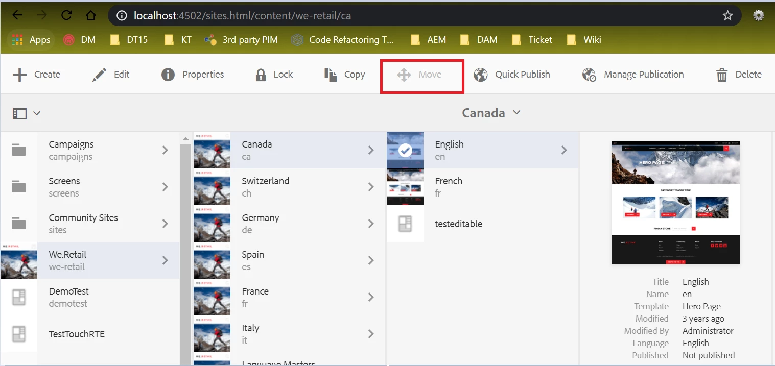 Move option is disabled in TouchUi (/sites.html) AEM 6.3 and AEM 6.5 | Community