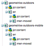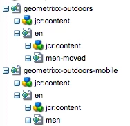 "men-moved" is added as cq:ExcludedPaths property to cq:LiveSyncConfig of geometrixx-outdoors-mobile/en