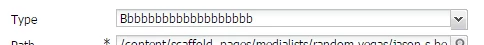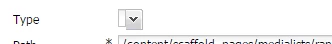 ......................................................................<fieldConfigs jcr:primaryType="cq:WidgetCollection" > <media-type jcr:primaryType="cq:Widget" fieldLabel="Type" name="mytype" type="select" width="{Long}360" options = "/etc/acs-commons/lists/types/_jcr_content.list.json" xtype="selection"/> <media-path jcr:primaryType="cq:Widget" fieldLabel="Path" allowBlank="{Boolean}false" name="myurl" rootPath="/content/scaffold/acmelists" width="{Long}360" xtype="pathfield"> </media-path> </fieldConfigs>......................................................................