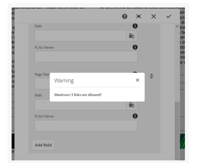 I am trying to validate my multifield dialog with maximum items to be allowed. my requirement is like I should be able to add only 5 items in the multifield. If I try to add the 6th item it should show a warning message like maximum 5 items are allowed. I tried the same thing with help of below article.