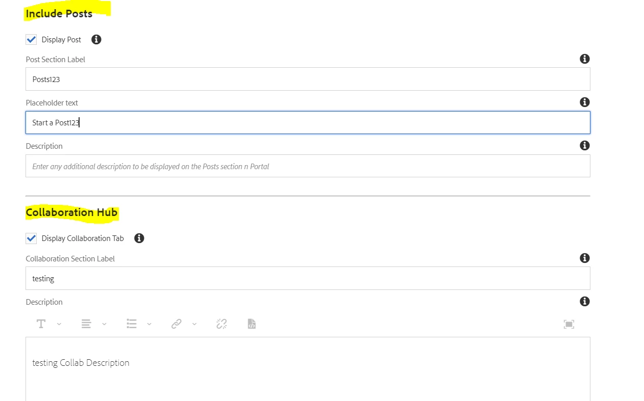 For example I have a section called Include Posts and Collaboration Hub in the CF, as shown below.