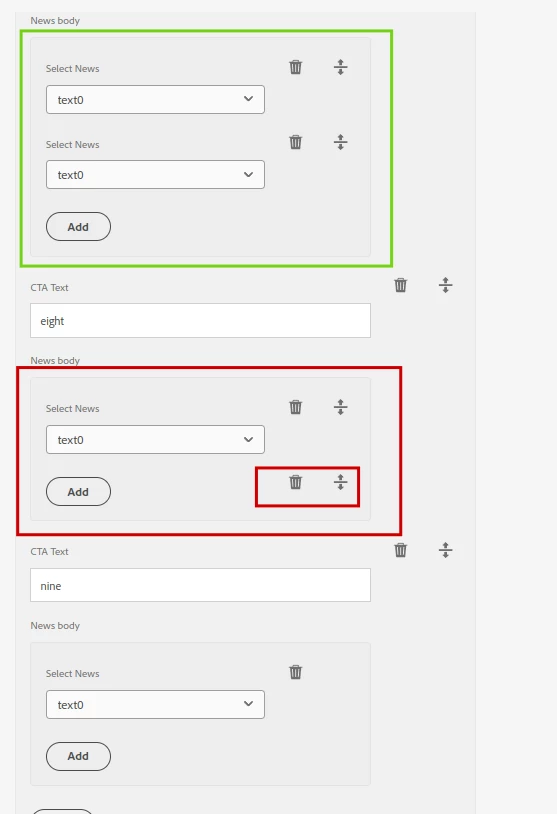 I can add multiple news field & under each "CTA Text", I can add several "Select News" field. After adding several News field, while adding several