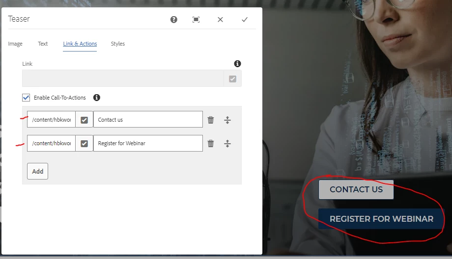 How do I make AEM open a new tab after clicking on the "Contact us" and "Register for webinar" buttons?