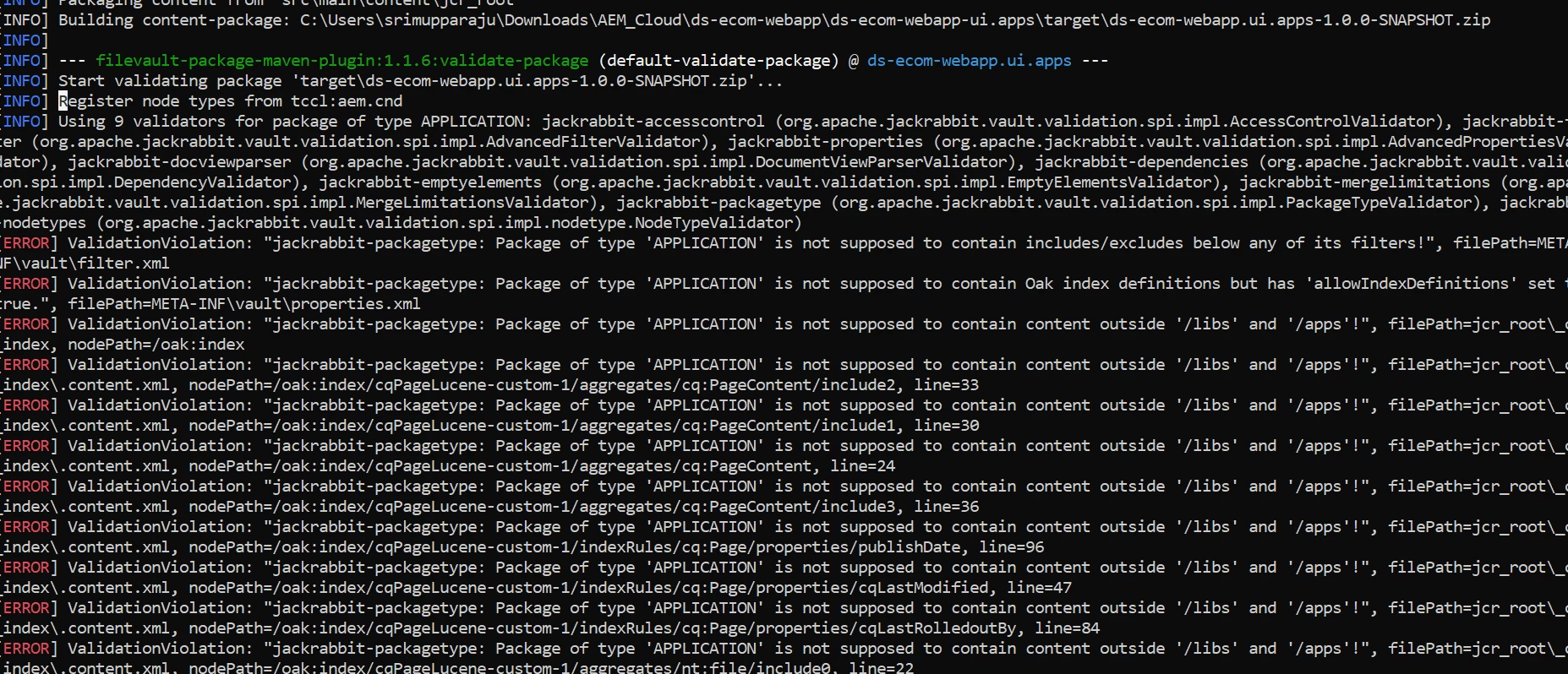 [ERROR] ValidationViolation: "jackrabbit-packagetype: Package of type 'APPLICATION' is not supposed to contain includes/excludes below any of its filters!", filePath=META-INF\vault\filter.xml
