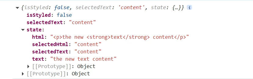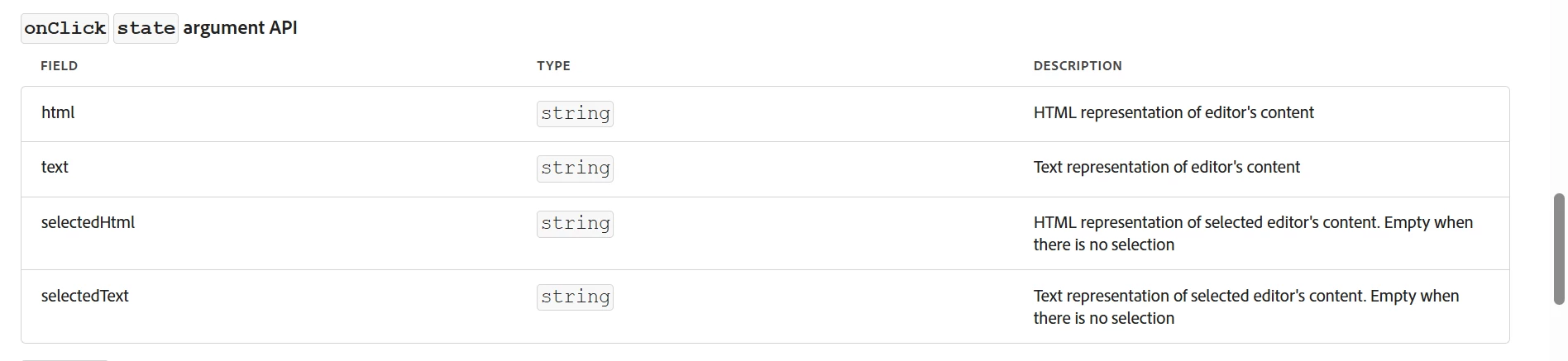 Hi, We are working on Content Fragment Editor extension. Using onClick state argument API, When we try to log the state. selectedHtml is returning only text not in HTML format. Please give some suggestion on this if anyone faced same issue. Reference:https://developer.adobe.com/uix/docs/services/aem-cf-editor/api/rte-toolbar/