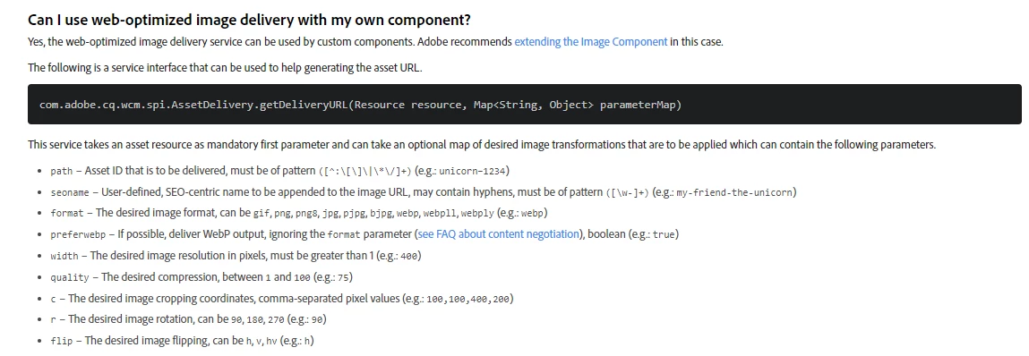 I am trying to optimize all the images on my pages using Web-Optimized Image Delivery, as described in the documentation: https://experienceleague.adobe.com/docs/experience-manager-core-components/using/developing/web-optimized-image-delivery.html?lang=en .