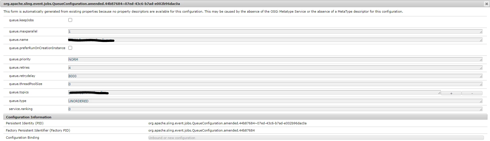 Now, I want to have my own custom Sling Job Queue Configuration with retry intervals and number of retries. For this, I have created the configuration manually from system console for the specific topic and it is working and picking this custom configuration when the job is failed. But, when I create the same configuration as part of code repo and when deployed, this configuration is not getting picked. And the way this configuration looks is completely different from the one created through system console. Below screenshots are the one created in system console and other deployed through code.
