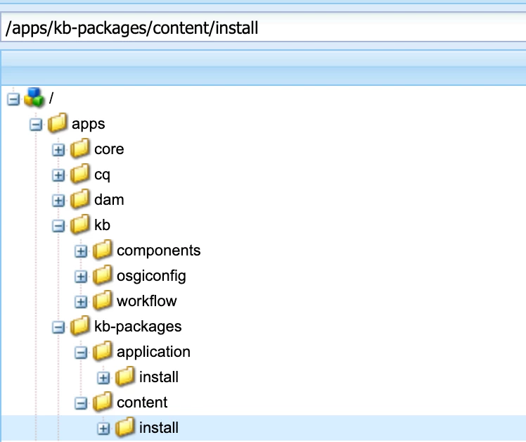 I have osgiconfig folder inside /apps/kb and I have install folder inside /apps/kb-packages. I could see these folders and files(config, jar, zip) files in local as below (local AEM )