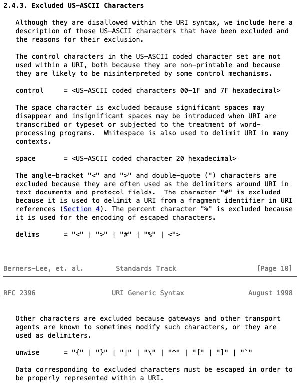 Going into RFC 2396 - https://www.rfc-editor.org/rfc/rfc2396, section 2.4.3 is what you probably looking for, as it clearly list disallowed characters with proper reasoning. So this is potentially list of character that could be problematic from Query Builder Debugger tool perspective.