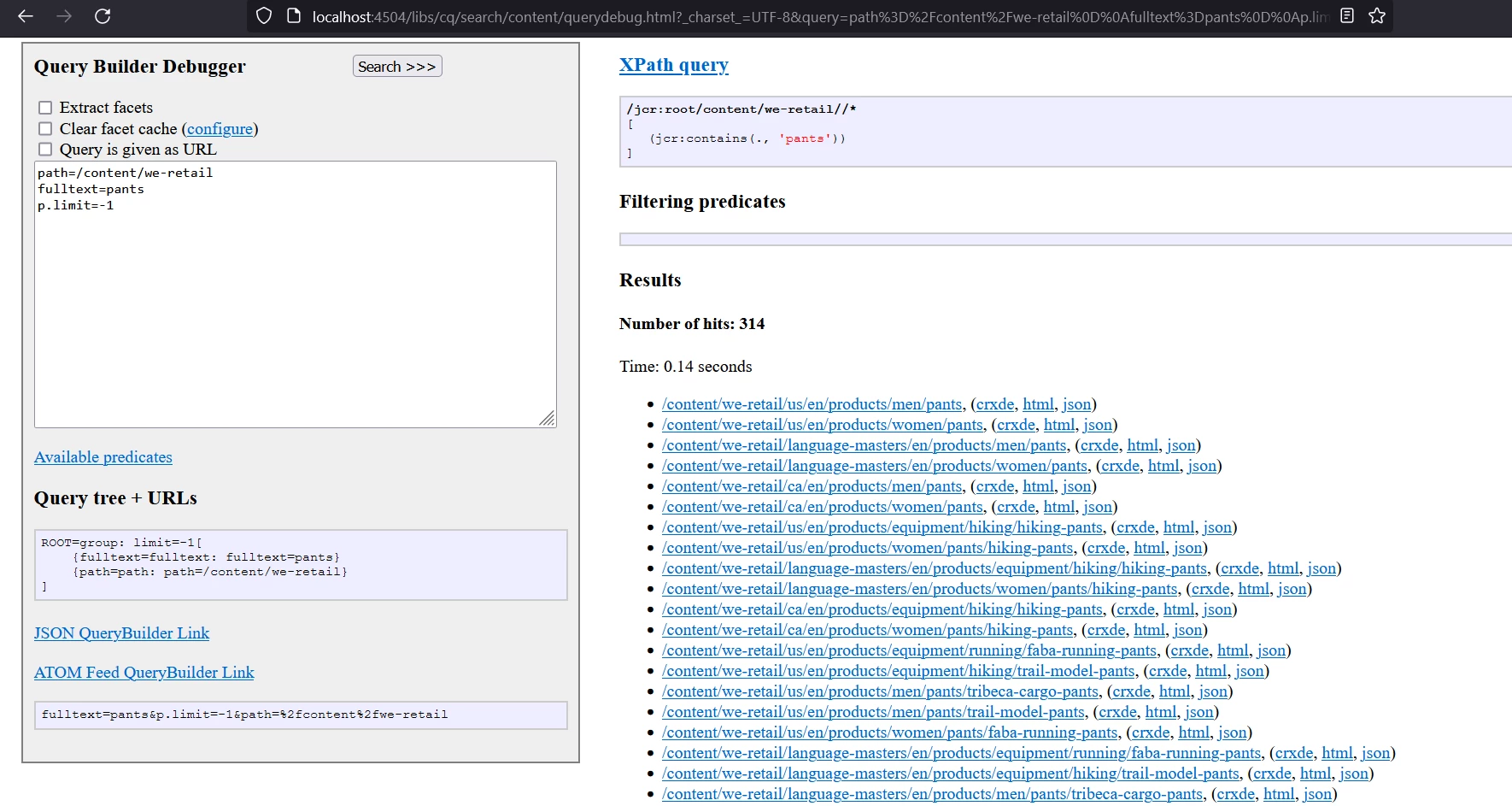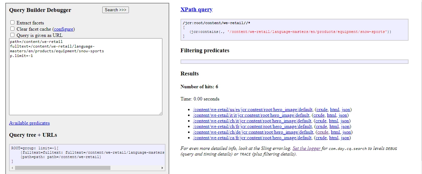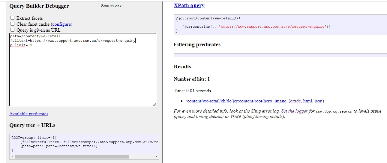 I am trying to query a specific URL that's in both component configs and plain RTEs in a specific path but the query builder debugger can't seem to find results that I know are def. on the pages.