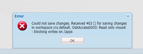 Could not save changes. Received 403 () for saving changes in workspace crx.default. OakAccess0003: Read only mount - blocking writes on /apps