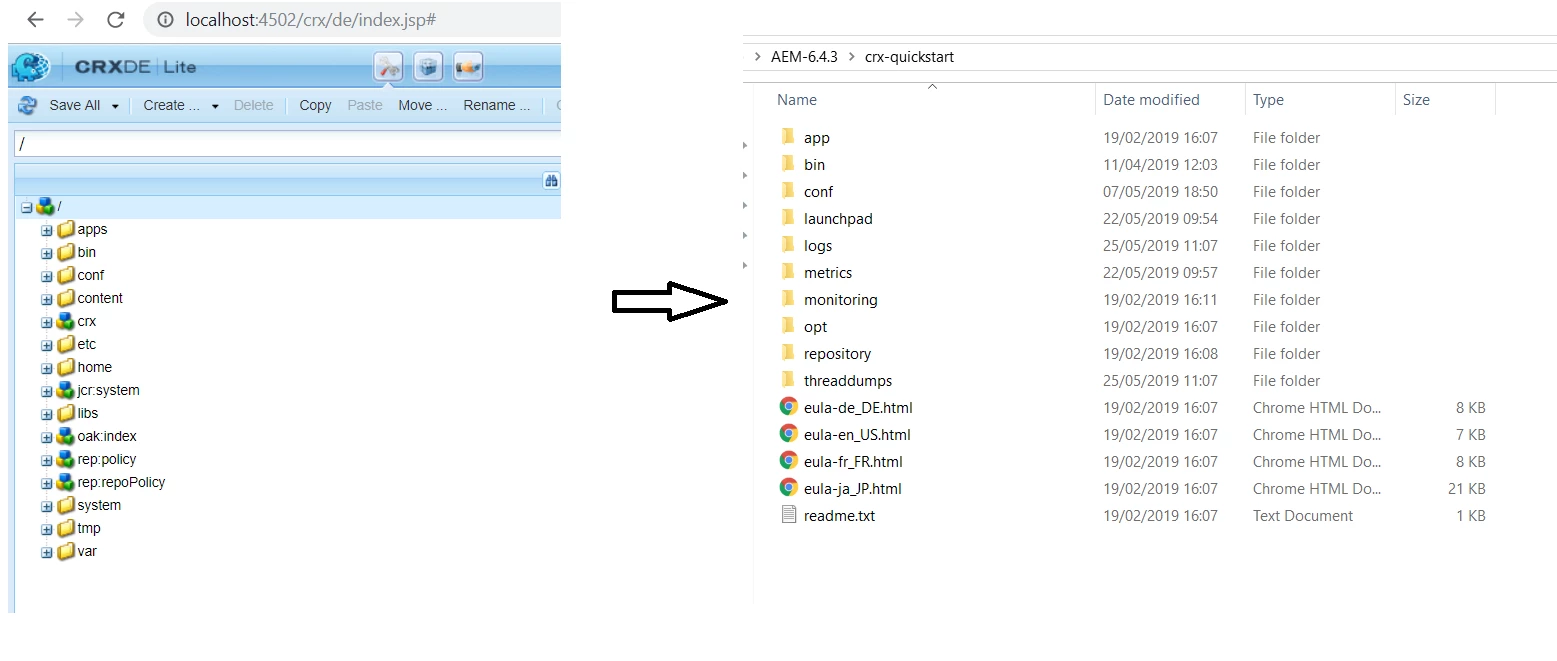 could someone explain what is the link between folders in crx/de and crx-quickstart folder? e.g where components from /apps/my-project/components will get saved in crx-quickstart folder and in which format.